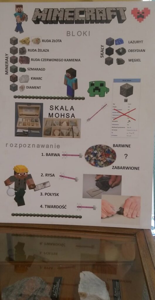 Łączymy też świat cyfrowy z rzeczywistym Pod Hasłem „Kto powiedział, że MINECRAFT to tylko gra?” uczniowie klasy 5 odwiedzili Muzeum Geologii Złóż Politechniki Śląskiej. Wspólnie wysłuchaliśmy ciekawych opowieści o zebranych eksponatach oraz podziwialiśmy skały i minerały z różnych zakątków świata.